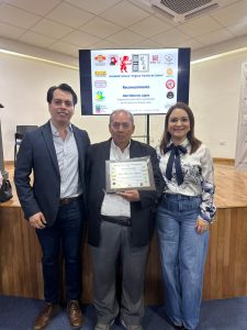 Raúl Collins Treviño, Presidente de la Sociedad “Virginia Treviño de Collins”, entregó la placa de reconocimiento a Abel Moreno.