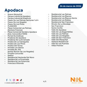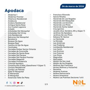 Colonias de Apodaca, Guadalupe y San Nicolás no tendrán suministro entre las 16:00 y las 00:00 horas del jueves 5 de marzo