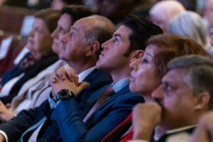 Acompañaron al Gobernador en la ceremonia de inauguración de la Cumbre el Secretario General de Gobierno; Javier Navarro; y María Cristina González Parás, presidenta y Directora del Encuentro Mundial de Valores, ABP.